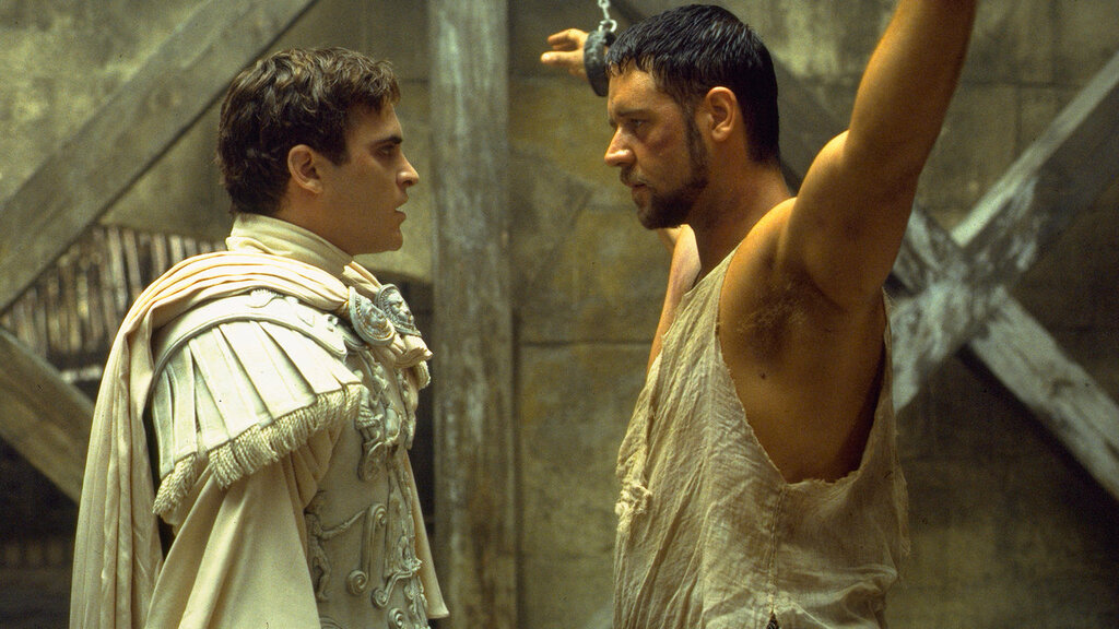 西暦180年、時はネルウァ=アントニヌス朝(いわゆる五賢帝時代)のローマ帝国が舞台。平民出身のマキシマス将軍は、アウレリウス皇帝から次期皇帝の地位を約束されるが、それを知った皇帝の息子・コモドゥスは父親を殺害。反逆罪で捕らえられたマキシマスは間一髪逃げ延びるが、剣闘士奴隷として生きることを余儀なくされるのです…
