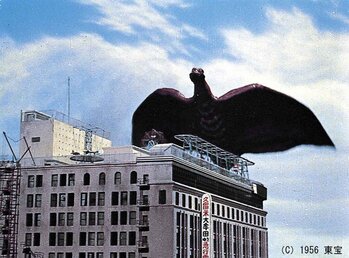 『空の大怪獣 ラドン』は、1956年(昭和31年)12月26日に正月興行用作品として公開された、東宝制作の怪獣映画です。カラー、スタンダード。特筆すべきなのは、本作が、初のカラー東宝怪獣映画になります。核の象徴としても位置づけられたゴジラと違って、ラドンはより生物的な側面を強調していて、その生態や出現経緯がリアルタッチで描かれているのが大きな特長です。内容は、巨大怪鳥・ラドンが陸・空・海で大暴れ!するという東宝特撮初のカラー怪獣映画です。